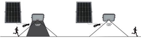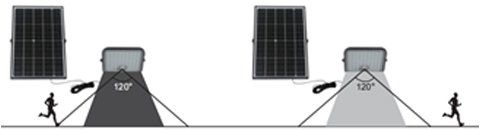 La lampe s'allume automatiquement la nuit et passe en pleine luminosité lorsqu'un mouvement est détecté dans la zone de détection 8 mètres, puis passe à une luminosité plus faible au bout de 60 secondes d'absence de mouvement.