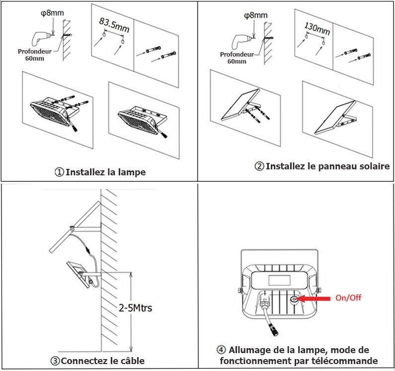 ① Percez 2 trous de Φ8mm avec une profondeur de 60mm et un espacement de 83,5mm sur le mur, fixer la lampe sur le mur avec des chevilles d'expansion et des vis.
