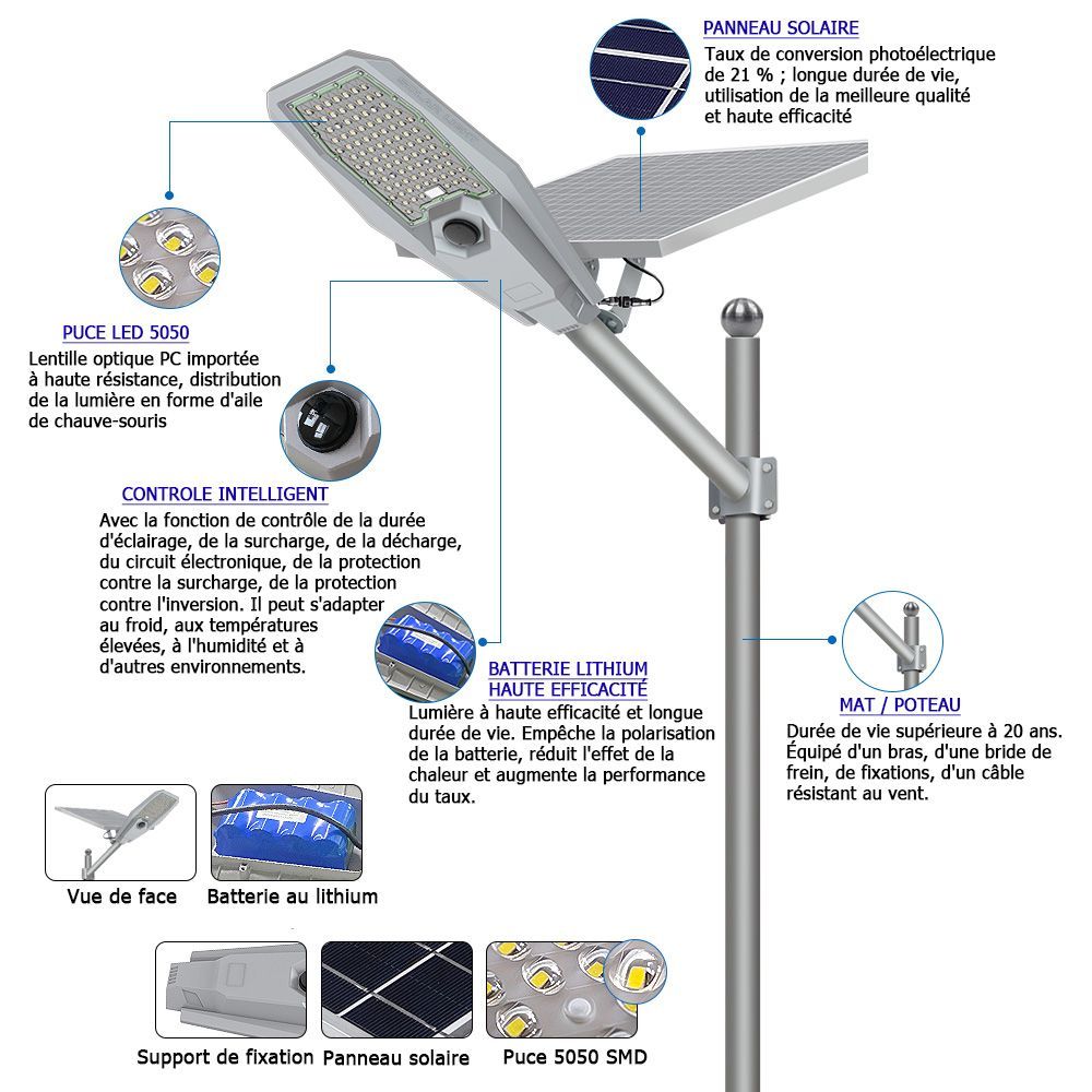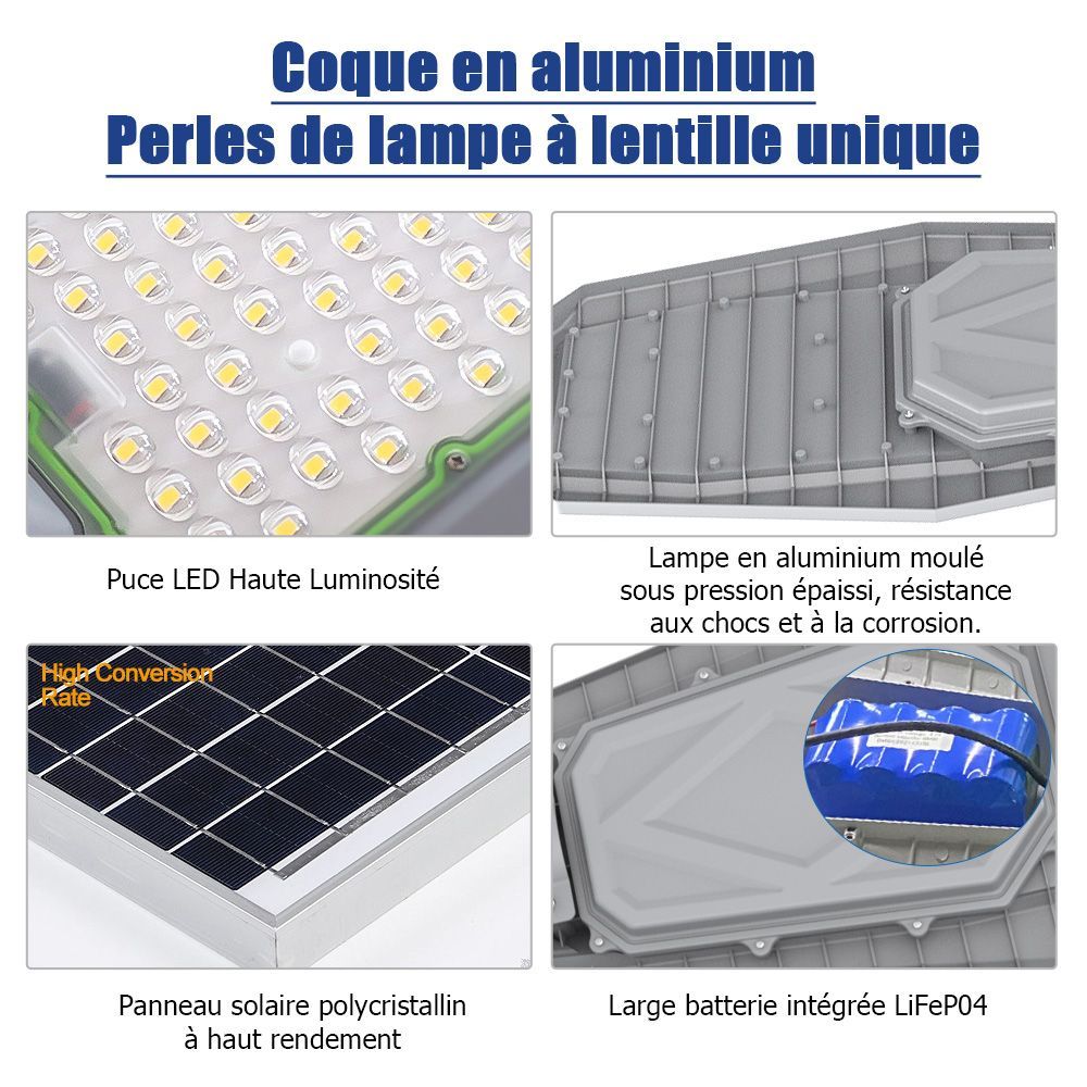 The built-in solar panel allows this street lamp to operate completely autonomously. The pack is equipped with a lithium-ion iron phosphate battery, a material of choice that can store a lot of energy without the risk of overheating. With a full charge, this solar lamp ensures a long autonomy that can exceed 18 hours. Its minimum lifespan is estimated at 50,000 hours, or a little over 5 years. Not to mention that once installed, it does not require any special maintenance.